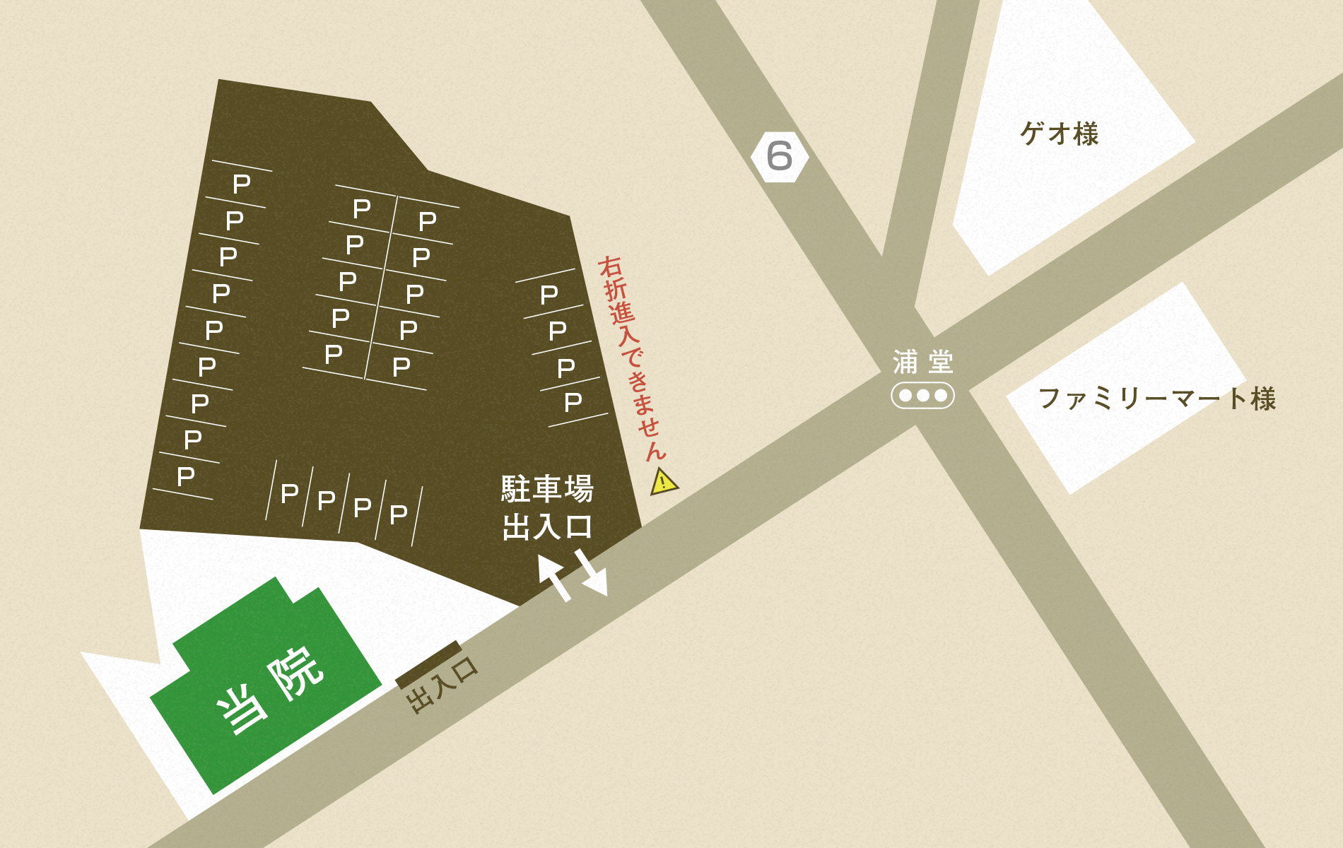 - 当院は病院敷地出入口と駐車場の出入口が異なります。お車でお越しの際はご注意ください。